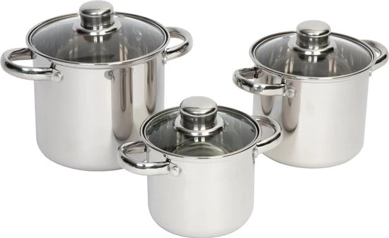 Een 3-delige RVS camping pannenset. Iedere pan heeft een stevig glazen deksel.