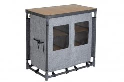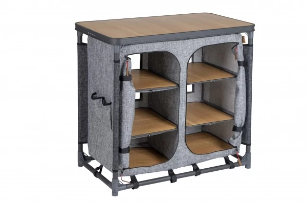 Dit kookeiland voor op de camping is niet alleen praktisch, maar ziet er ook nog eens heel stijlvol uit. De kookkast heeft 6 vakken, voor potjes en pannetjes. De verstelbare poten zijn afzonderlijk af te stellen zodat de legkast op iedere ondergrond stabiel staat. De kast wordt geleverd in een handige draagtas.