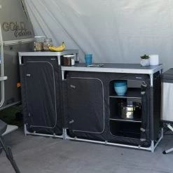 Op zoek naar een praktische kast voor in de tent? Dit is een stevige, grijze campingkast met aluminium frame van Compart Travel. De kast heeft 4 verstelbare poten en opbergvakken aan de zijkant. Compleet geleverd met draagtas.
