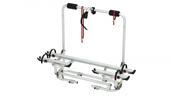 De nieuwe versie van het fietsenrek Caravan XLA. Deze fietsendrager is kantelbaar zodat de ruimte van de disselbak bereikbaar blijft, zelfs wanneer de fietsen nog op het fietsenrek staan. Snel en praktisch opladen van de fietsen.