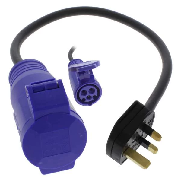 Met deze verloopstekker kun je de CEE kabel van je caravan of camper ook gebruiken in Engeland.
