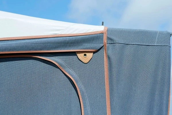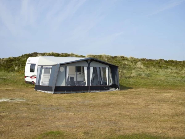 De grote ramen in de front- en zijpanelen zijn rond afgewerkt in de bovenste hoeken en zorgen samen met de hoge ramen achter in de zijwand voor voldoende licht in de gehele voortent. Het ademend Isacryl materiaal is bijzonder kleurvast en zorgt samen met de ingebouwde nokventilatie voor een prettig binnenklimaat. Op warme dagen bieden de insectenhorren in de beide zijwanden voldoende ventilatie.