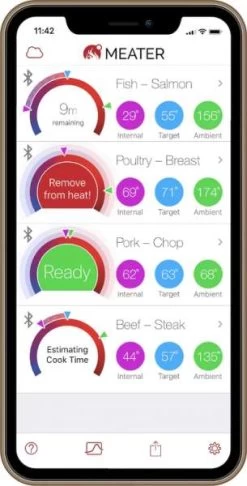 Steek de Meater in het vlees, open de Meater app en selecteer het gerecht. Zo krijgt iedereen z’n vlees zoals hij dat lekker vindt. Jij rare en je vrienden medium rare bijvoorbeeld. Dankzij de nummering van de thermometers houd jij het vlees makkelijk uit elkaar. De app geeft je een seintje wanneer het gerecht klaar is. Wil je graag dichtbij het vuur staan? Dan bedien je het OLED touchscreen via het Meater thermometer blok. Genieten maar!Â