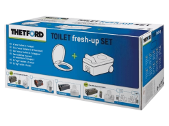 De Toilet Fresh-Up set van Thetford is een ideale set om het toilet in uw caravan of camper er weer zo goed als nieuw uit te laten zien. Dat is natuurlijk helemaal ideaal na de aankoop van een tweedehands huisje op wielen of als hij net uit de winterstalling komt. De set heeft een afvaltank op wielen en een toiletbril met deksel.