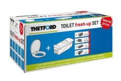 De Toilet Fresh-Up set van Thetford is een ideale set om het toilet in uw caravan of camper er weer zo goed als nieuw uit te laten zien. Dat is natuurlijk helemaal ideaal na de aankoop van een tweedehands huisje op wielen of als hij net uit de winterstalling komt. De set heeft een afvaltank op wielen en een toiletbril met deksel.